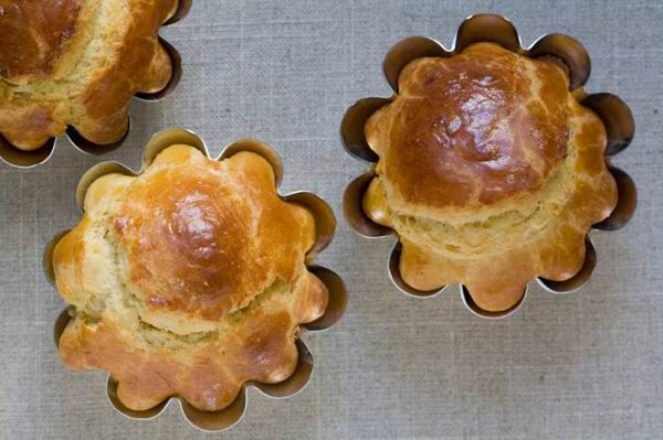 A megkelt tésztát lisztezett felületre borítjuk, és kissé kipüföljük belőle a levegőt, majd nagyjából 3-4 cm átmérőjű hengerré sodorjuk. A tésztahengert 12 darabra vágjuk. Mindegyik karikának lecsípjük nagyjából a negyedét. A nagyobb tésztarészeket gombóccá formázzuk, és beletesszük az előkészített sütőformákba. Egy nagyobb fakanál nyelével minden tészta közepére mélyedést fúrunk, ebbe illesztjük a lecsípett, szintén gömbbé formált kisebb tésztadarabokat. Az egészet letakarjuk konyharuhával, és addig pihentetjük, amíg a tészta kitölti a formákat.